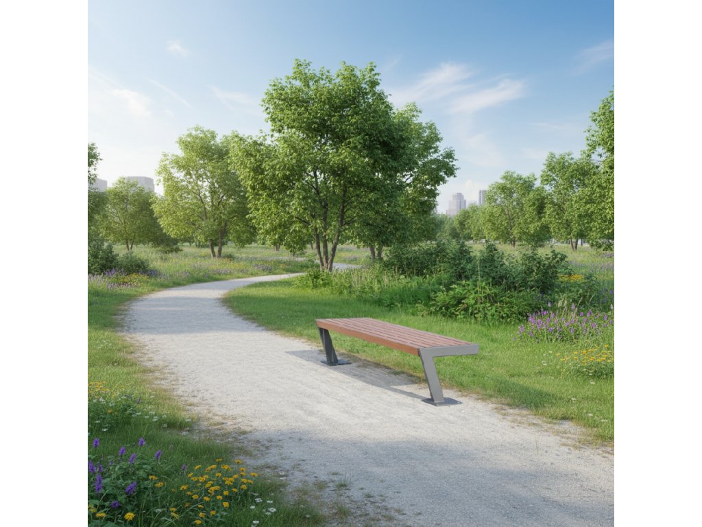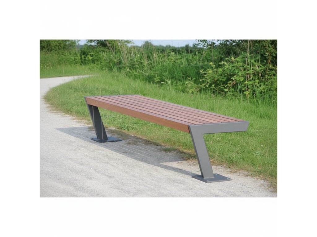 Parková lavička bez opěradla zad. Řada lavičky Dynamic je univerzální ekonomická lavička vhodná do venkovních prostor s větším nebezpečím poškození a vandalizmu. Robustní ocelová konstrukce je opatřena vypalovaným lakem nebo zinkem a doplněna masivními dřevěnými prkny ošetřenými lazurovacím lakem.