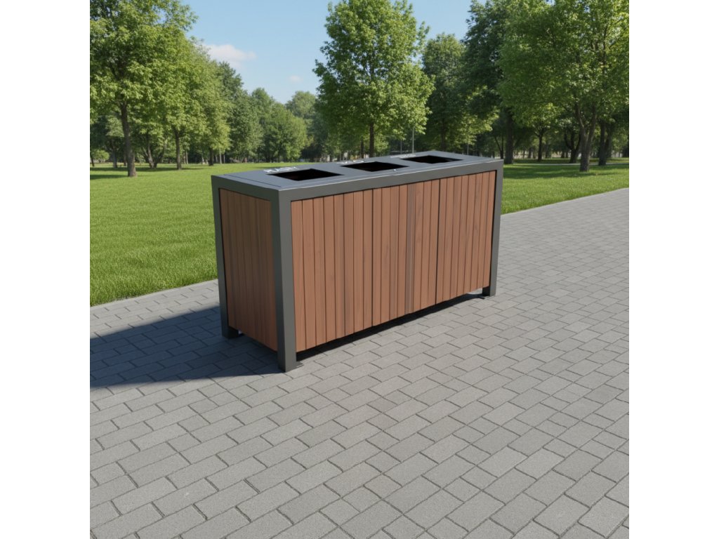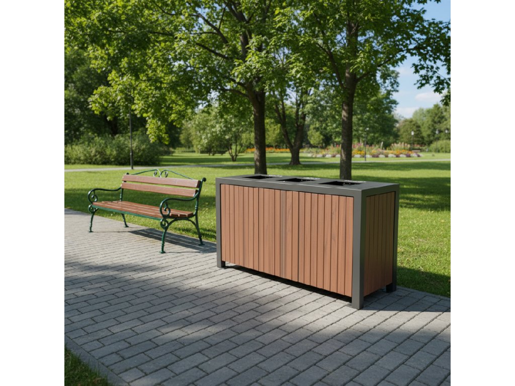 Odpadkový koš, typ Židllochovice. Tento trojkoš může být vyroben s popelníkem i bez popelníku .