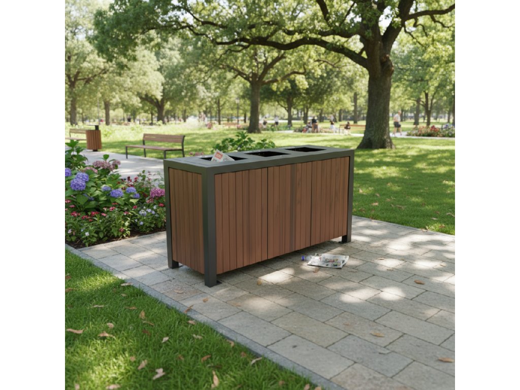 Moderní venkovní odpadkový koš z nové řady městského mobiliáře.