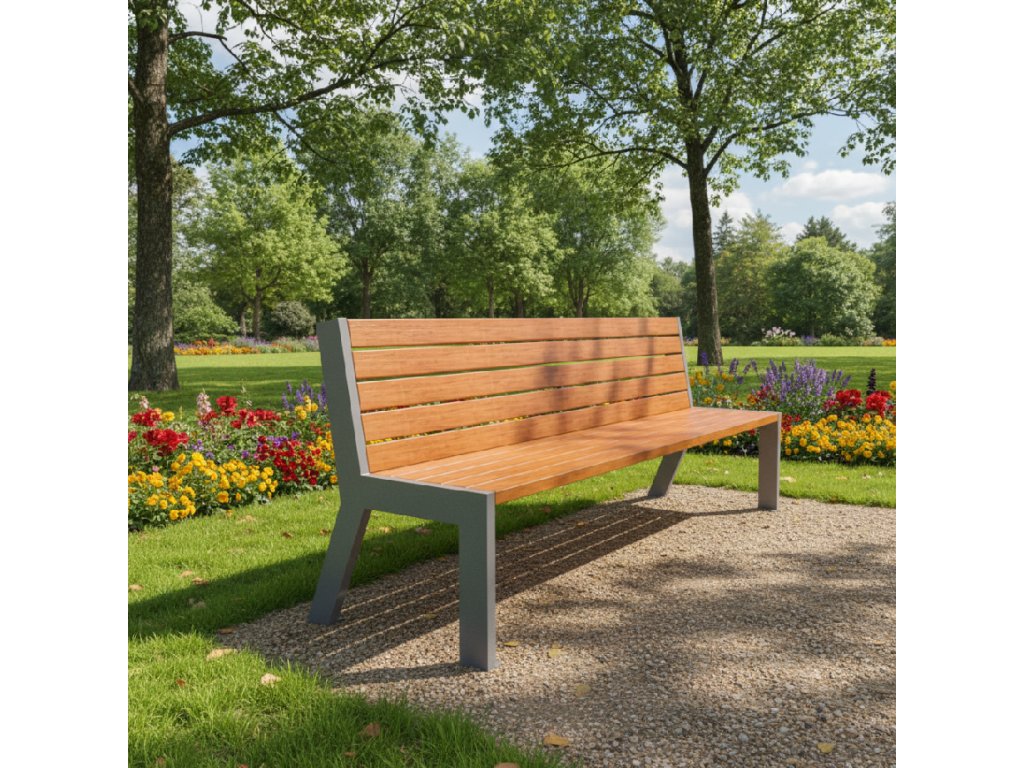Lavičky příjemného designu, vysloveně lákající k posezení. Elegantní vzhled spojeného sedáku s opěrákem z latí je nesena dvěma subtilními nohami z kovu.